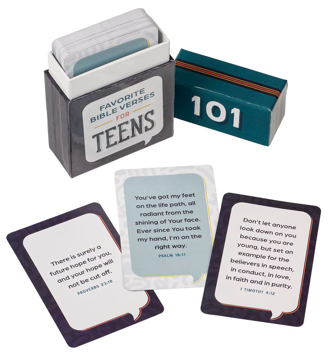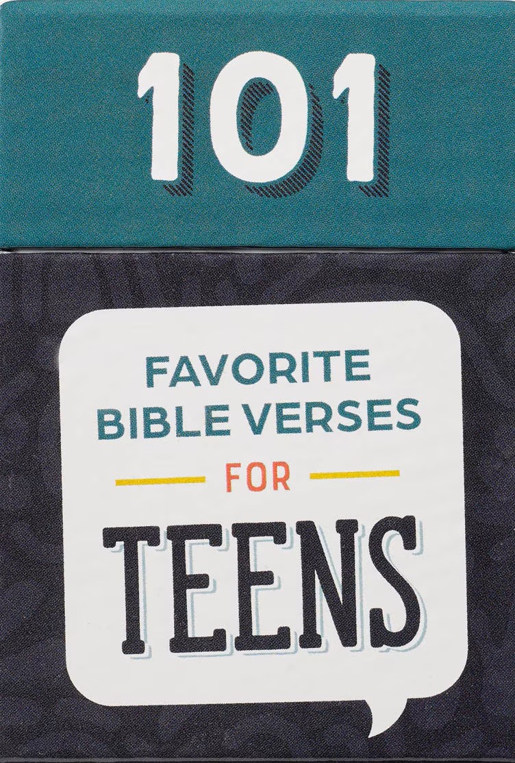 The 101 Favorite Bible Verses for Teens Teal and Blue Box of Blessings is the perfect gift for all the teenagers in your life. This inspiring box of cards is filled with 101 Bible verses to help teenagers deal with faith, life, love, and God. The indigo-blue Box of Blessings is topped with a teal lid that fits snuggly. The title starts on the lid in large white letters and continues on the body of the box in a white frame, where it is printed in teal, red and blue letters —an eye-catching design sure to appeal to teenagers. Each of the 51 double-sided cards features a Scripture verse on the front and back. The cards are designed in the same style as the box and cycle through three unique designs. These small cards that fit in the palm of your hand can be passed out individually to teens, or the box can be given as a whole as a gift on a special occasion such as graduation or a birthday. This inspiring and uplifting gift is perfect for any teenager looking to strengthen their faith and connect with God on a deeper level. Pair the 101 Favorite Bible Verses for Teens Box of Blessings with a Bible as a graduation gift, or add it to a birthday gift to infuse a spiritual element into the celebration.