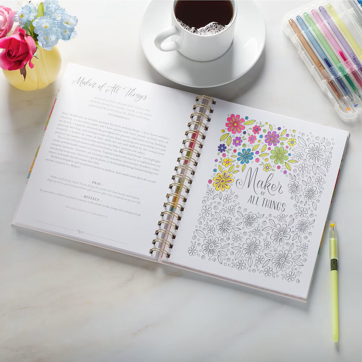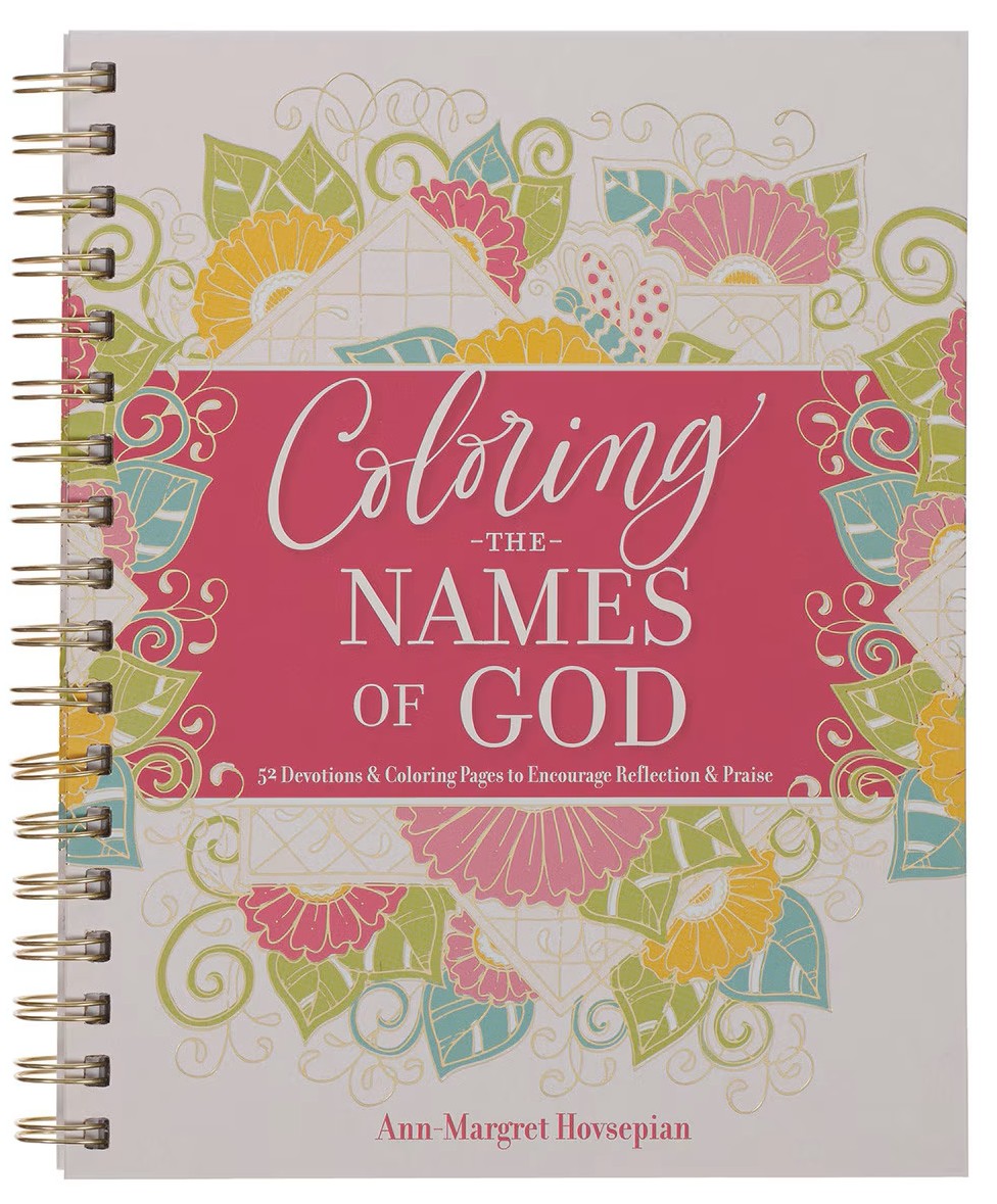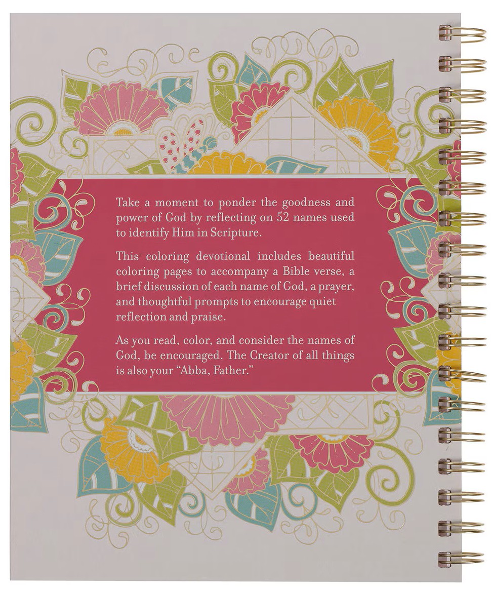 In the Coloring the Names of God Coloring Devotional, you can reflect on 52 names used to identify God in Scripture. As you ponder the meaning of these names while coloring the accompanying illustrated Bible verse, your mind will be prompted to praise God for who He is. The hardcover coloring book features a bright, inviting cover design with a vibrant pink, yellow, teal, and green floral arrangement that peeks out behind a bold pink frame. Gold-foiled details are elegantly added to spruce up the design. The frame holds the white-lettered and embossed title and sub-title. The raised embossed letters add an interesting tactile element. This coloring devotional includes beautiful coloring pages that accompany a Bible verse, a brief discussion of each name of God, a prayer, and thoughtful prompts to encourage quiet reflection and praise. Coloring pages are printed on the right-facing pages, and devotional content is printed on the left. As you read, color, and consider the names of God, be encouraged. The “Creator” of all things is also your “Abba, Father.”
