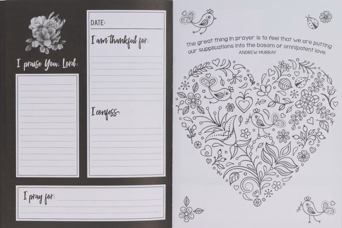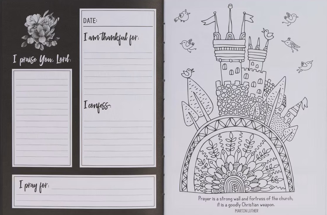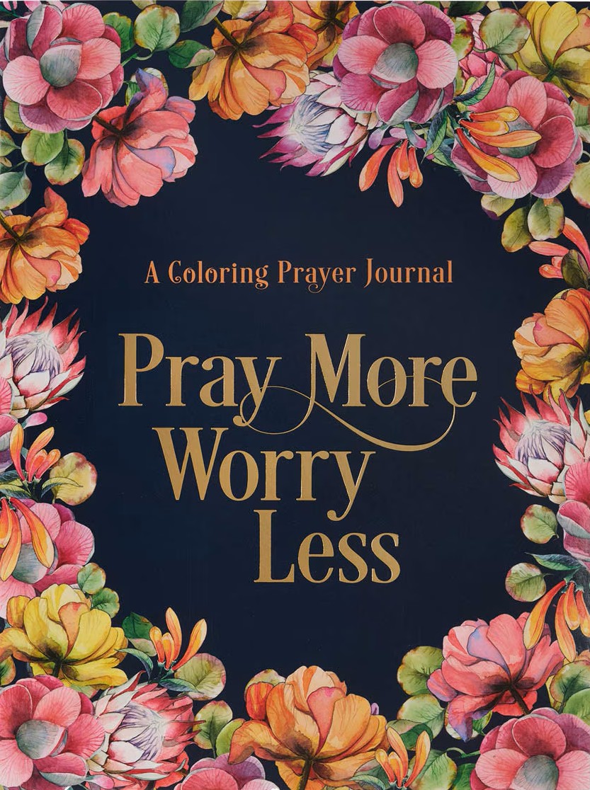 The Pray More Worry Less Coloring Prayer Journal is a guided coloring prayer journal designed to lift your spirits and ease your burdens through creative meditation and prayerful contemplation. The prompted journal has a softcover binding decorated with a black background encircled with colorful exotic flowers and succulents. The title is printed in gold-foiled letters and has an orange sub-title. The Smyth-sewn binding ensures all 128 pages open completely flat so you can color right up to the page edge. A line-drawn presentation page invites you to start coloring on page one. This page lets you personalize the prompted journal with a message when you give it as a gift. Alongside each guided prayer page, you can color and express your heart through coloring pages paired with inspirational quotes on prayer, beautifully designed Scripture verses to color, and prompted pages for you to complete and make uniquely yours. The Pray More Worry Less Coloring Prayer Journal will teach you to spend time with God in the quietness and solitude of prayer, renew your hope, and strengthen your courage for each new day. When life is busy, and there are many challenges, it is comforting to have a place of prayer to retreat to. The Pray More Worry Less Coloring Prayer Journal is a creative prayer journal that allows you to record your praises and thanksgiving to God. It also includes space for your confessions and prayer requests. Give the Pray More Worry Less Coloring Prayer Journal as an encouraging gift to a friend who wants to grow in her prayer life.