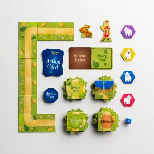 - Includes: 42 Tiles, 1 Blue Dice, 4 Recue item tokens, 4 Obstacle/Sheep tokens, 1 Shepherd, 1 snake, 10 Action cards and 1 collection card