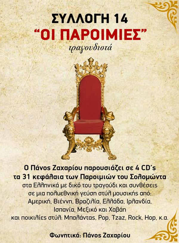 Ο Πάνος Ζαχαρίου παρουσιάζει σε 4 CD’s τα 31 κεφάλαια των Παροιμιών του Σολομώντα στα Ελληνικά με δικό του τραγούδι και συνθέσεις σε μια πολυεθνική γεύση στιλ μουσικής από: